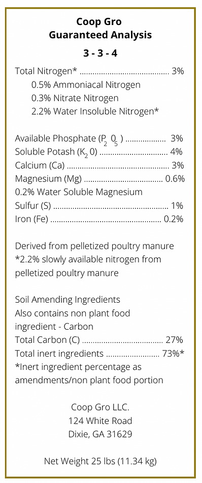 Coop Gro Fertilizer has a 3-3-4 guaranteed analysis. The 3% nitrogen portion includes 0.5% Ammoniacal Nitrogen and 0.3% Nitrate Nitrogen, which is readily available to plants. The remaining nitrogen is slowly released as the fertilizer is digested by microorganisms in the soil.